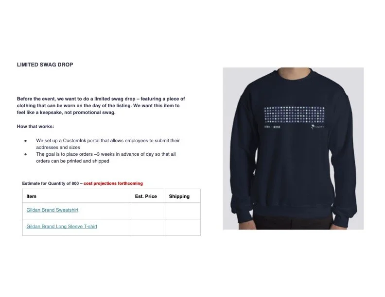 I played a key role in assisting the creative team with a project aimed at celebrating the company's public listing on the New York Stock Exchange. My primary responsibility was to coordinate a swag drop that would encapsulate the excitement of this milestone.